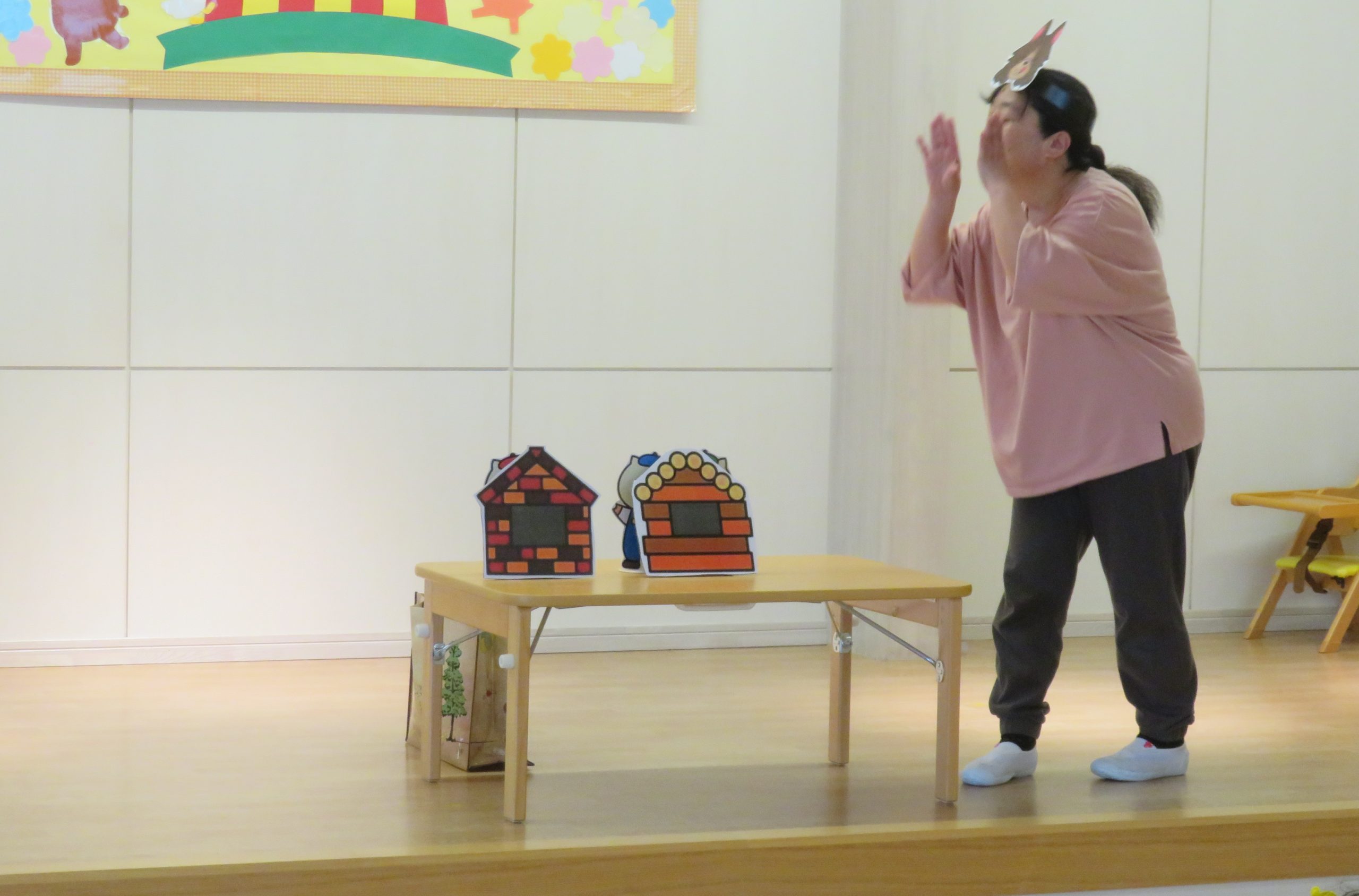 3匹のこぶたのお話しを聞きました。「こんな家吹き飛ばしてやる!!」