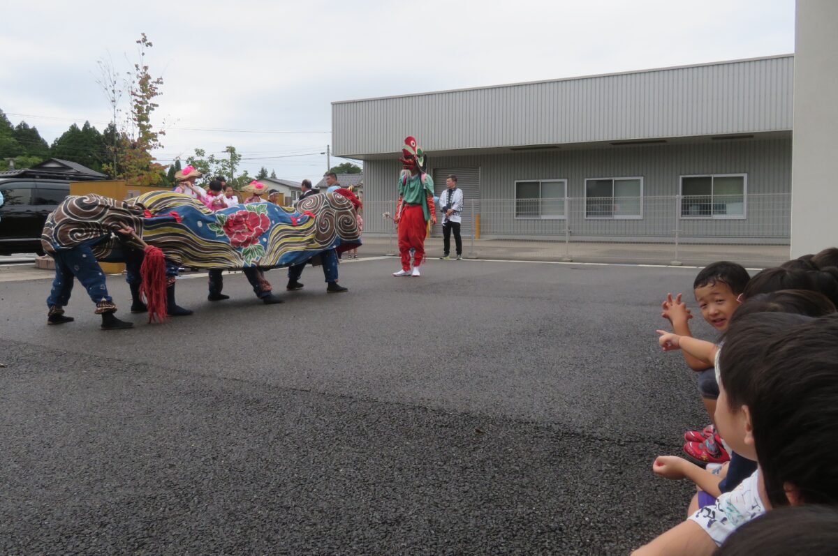 垣吉・高田町のお祭りの日、獅子舞が園に来てくれました!怖がる子、「お祭りだ!」と喜ぶ子など様々でした!