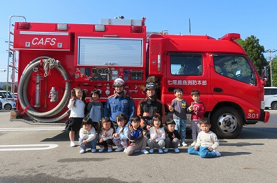 和倉消防の方に来ていただき、全園児が参加して、総合訓練を行いました。