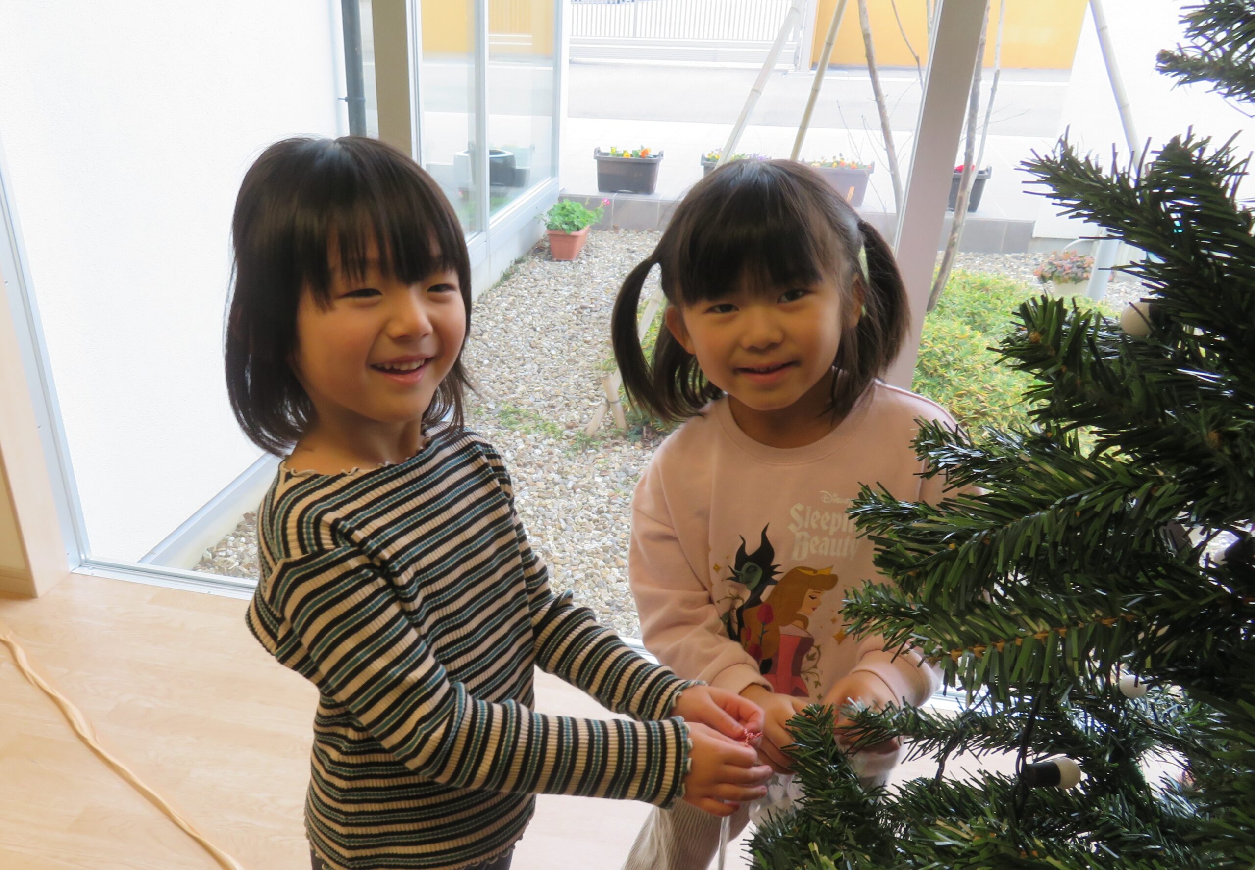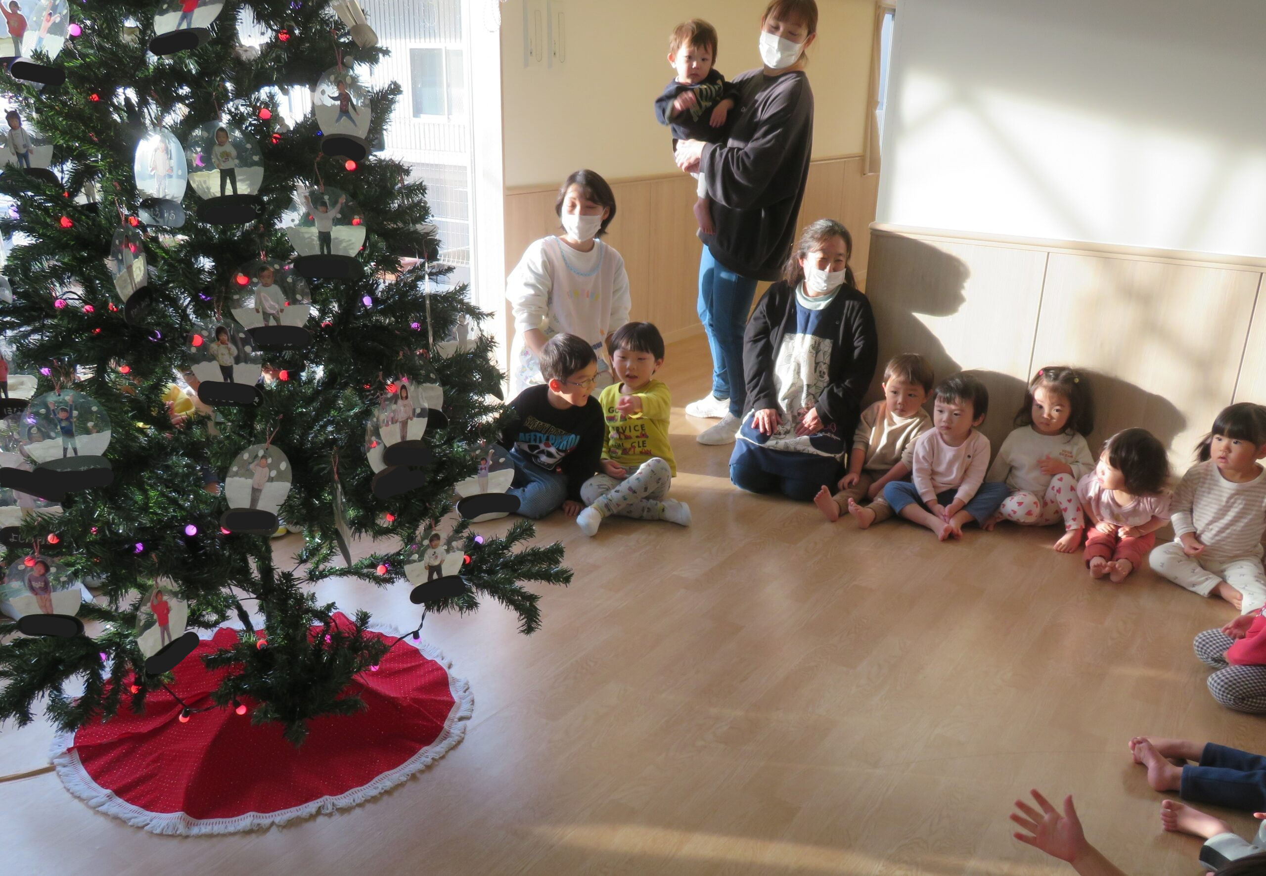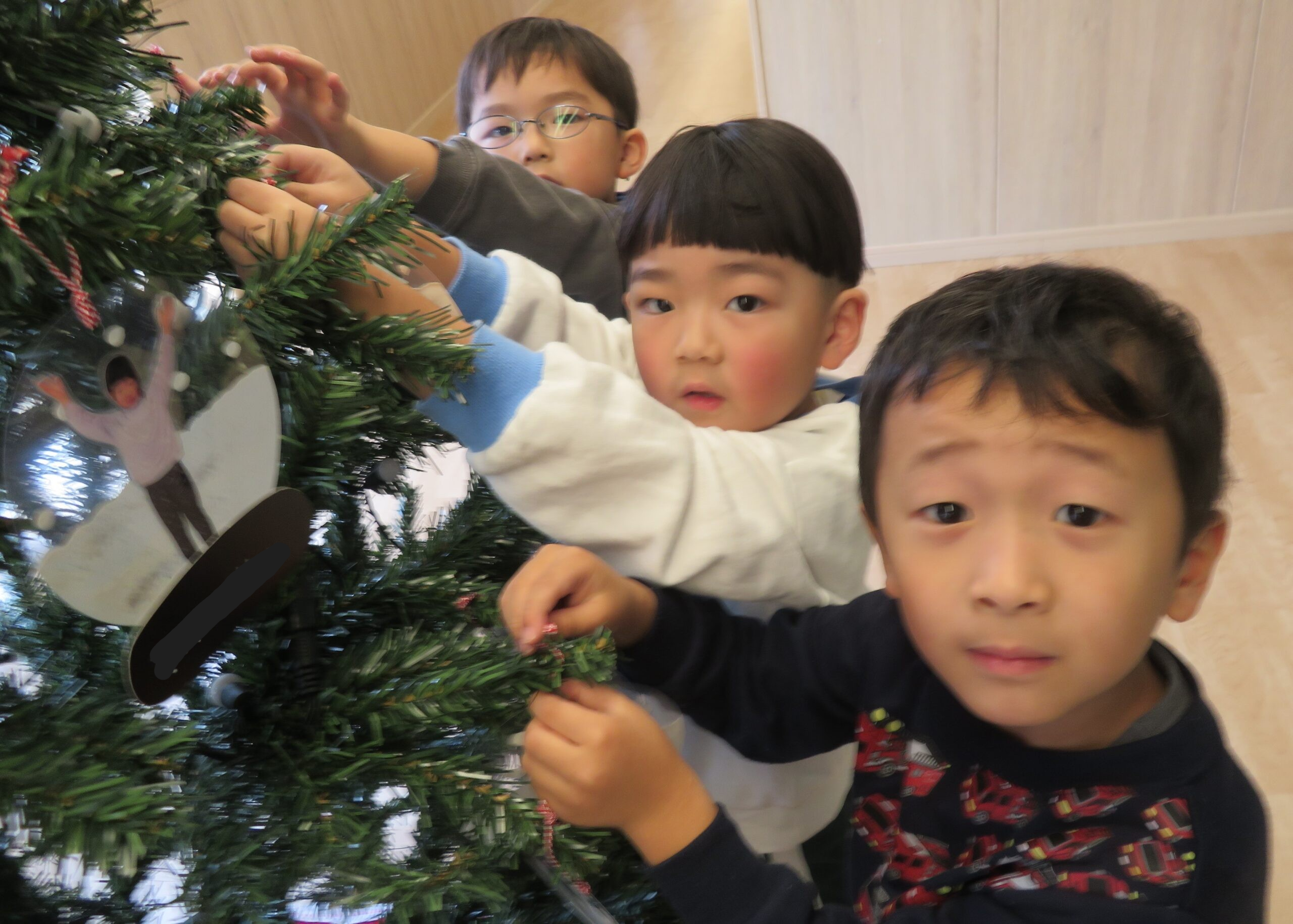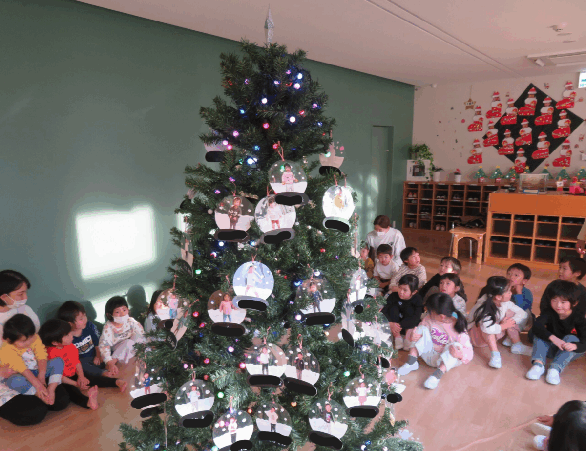 クリスマスツリーに子どもたちの写真入りのオーナメントを飾り付けました。そして、みんなで点灯式を行いました!