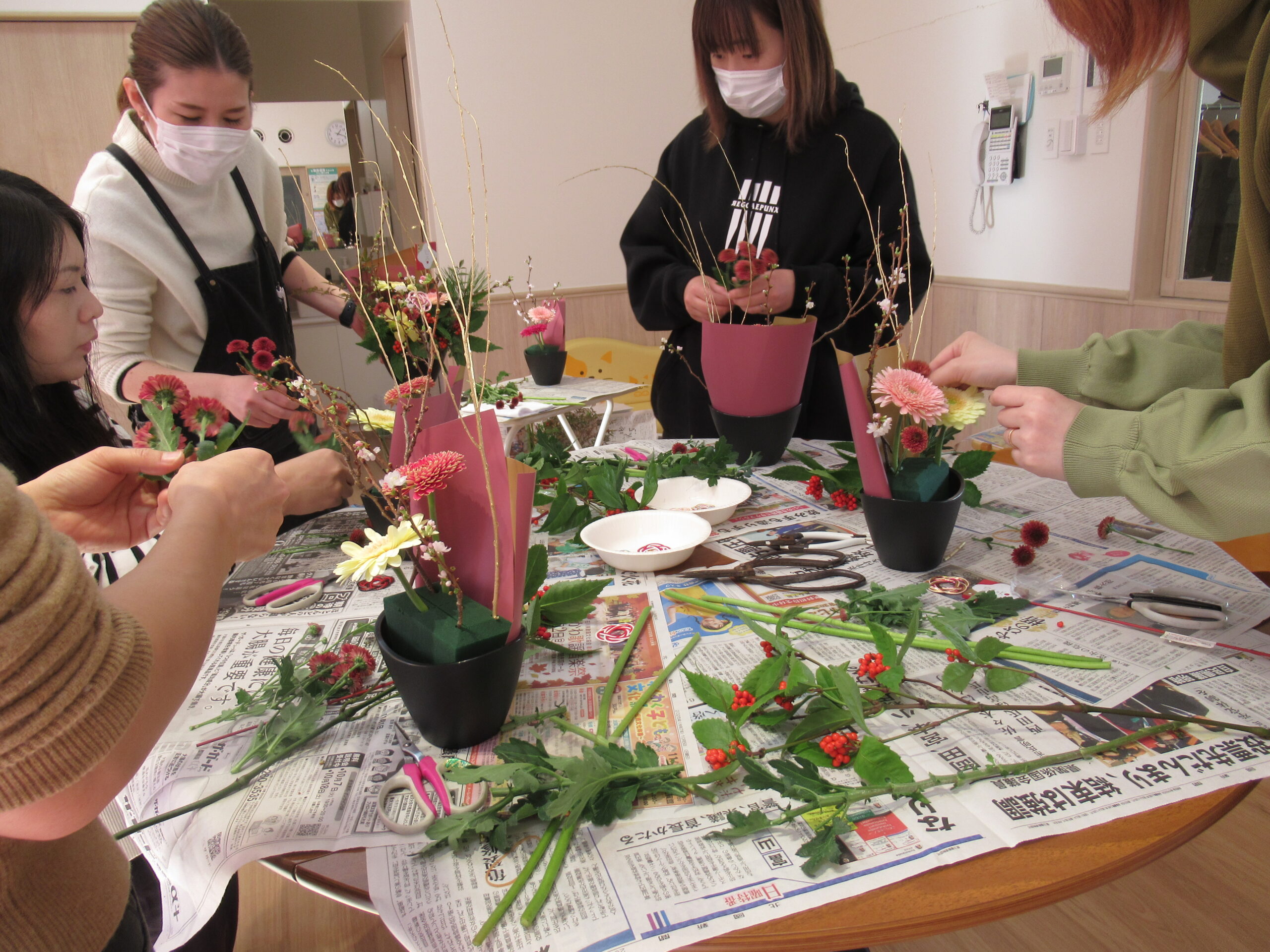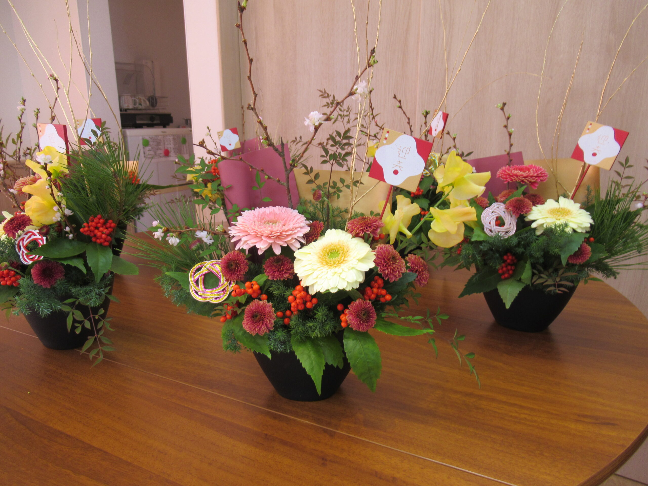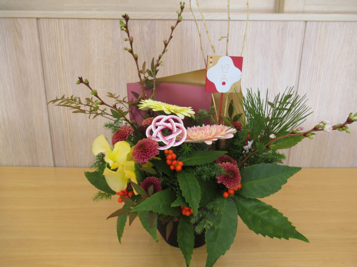 お正月花アレンジメントをしました。 --2025年12月19日 更新-- お花屋さんに来ていただきお正月のフラワーアレンジメントをしました。 お正月用のお花や教材を使って真剣にいけています。同じお花を使いましたが、それぞれの個性が出て皆さん素敵に出来上がりました。
