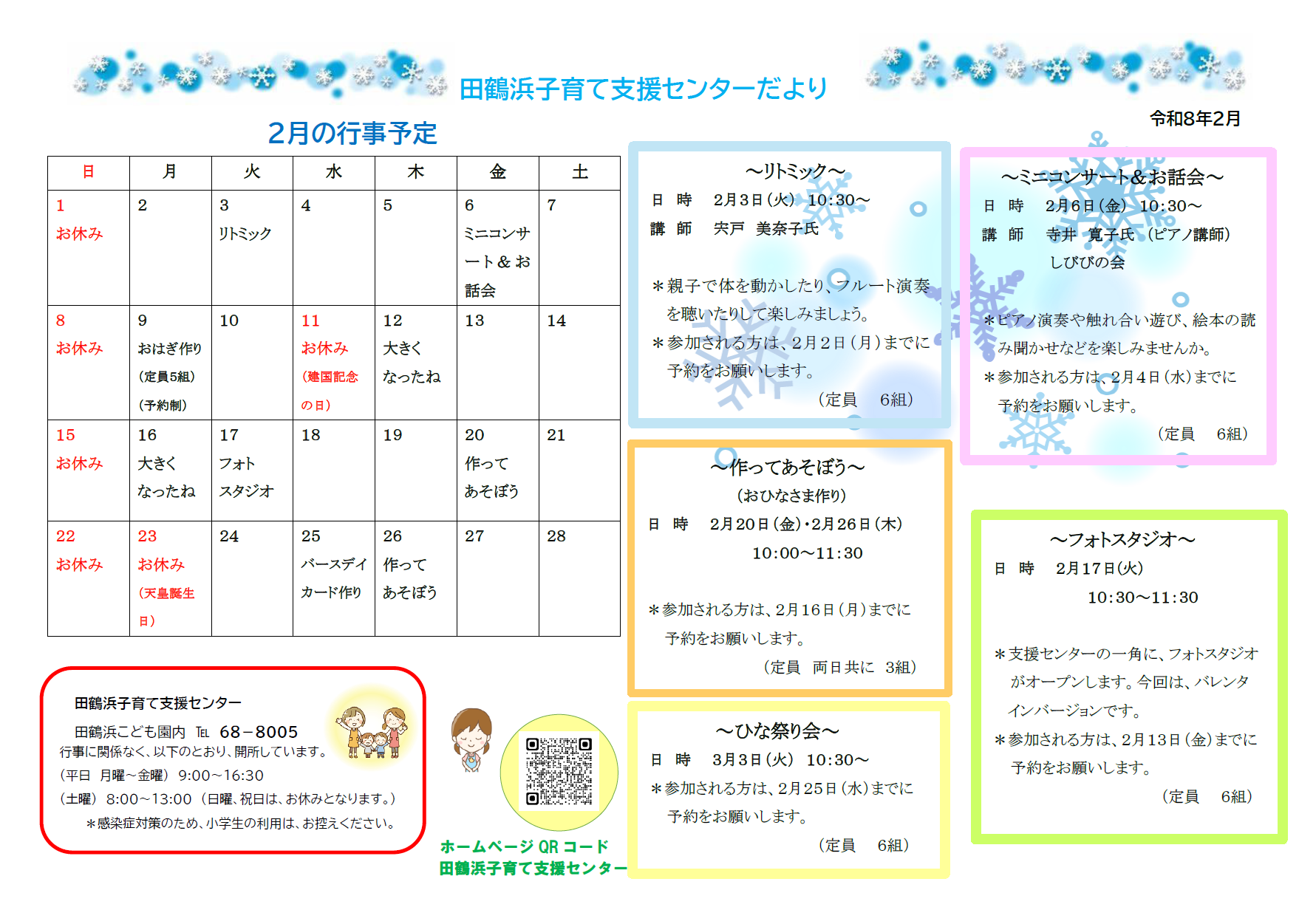 田鶴浜こども園内で、開設している「田鶴浜子育て支援センター」です。地域の子育て中のお母さん方が交流を通して、親子で楽しく過ごせるような場所にしていきたいと思っています。 また、育児でお悩みのことがありましたらご相談下さい。 開放日は、平日の月曜日~金曜日の午前9時~午後4時30分、土曜日は午前8時~午後1時までです。 どうぞご利用下さい。